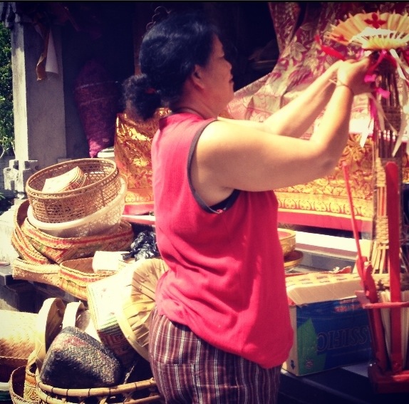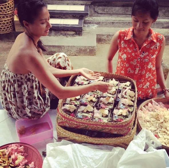 Learning to prepare the offerings for the upcoming Galungan Hindu holiday.