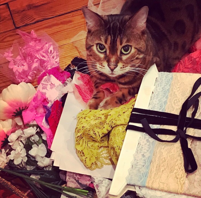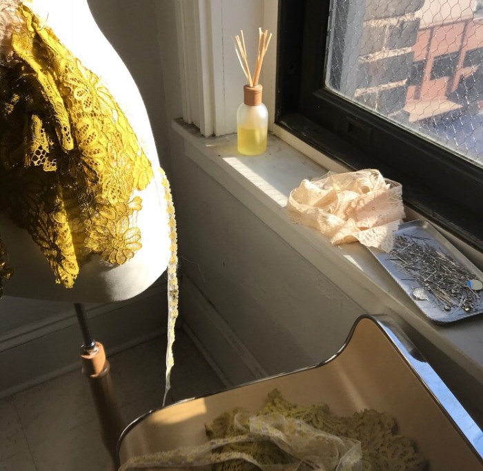Ingredients for a dress: flowers, vintage lace ribbon, and a cute little companion happy to share space.