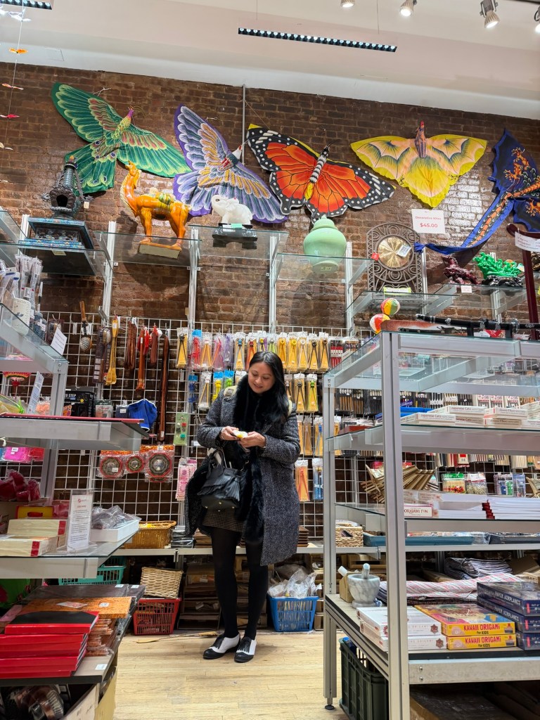 I had arrived, but I was not mentally present. I wasn’t even wearing a garment from my collection. It was cold, and it was much nicer to stay in my Doctoral fashion, as I call it, and simply walk around and note the suppliers I would engage the next day.Paula arrived with her brightness and cheer, and we laughed and talked for hours. She would have very easily fit in with the fashion industry, walking the floor and being inspired by creativity.Next on the train was Pat Bourque, arriving mid-day, as we sat on the rooftop in Tribeca planning out our content capture. This time I was ready and fully present in heart and mind. I was glad I had decided to wear this suit, as the fabric supplier mentioned, “Do you know you are wearing our lace?” I smiled and turned around, noting that I had sourced it from their collection and that I loved it. I was excited and inspired to find the most beautiful fabrics that will be shipped to Baltimore to sew these fashion ideas into the Elsa Fitzgerald house.I found a little frangipani flower in a shop, and it served as a gentle reminder of Bali and of embracing this part of myself that is Indonesian, while building a fashion house through the varying chapters that make up this life. Don’t you just love the kites on the top of the shop walls? I might have to come back on my next visit to bring home that butterfly.